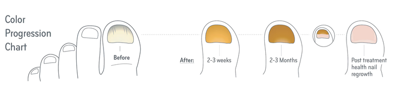 As the nail grows, older areas are gradually replaced. The temporary color change seen early on is expected and indicates penetration into the nail keratin.